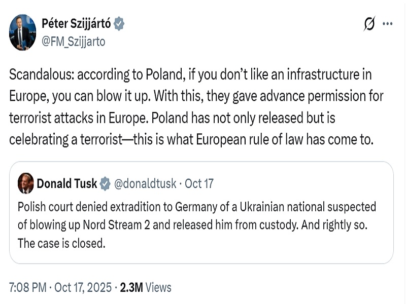 Polish Judge Dariusz Lubowski ruled against extraditing a suspect in the Nord Stream attack to Germany on the grounds that this act of sabotage occurred in the context of a “just, defensive war”, Germany doesn’t have jurisdiction over the international waters in which it occurred, and the Ukrainian state would be responsible if it really orchestrated this attack, not the conspirators who carried it out. That enraged Hungarian Foreign Minister Peter Szijjarto despite his country having no direct stake in this.