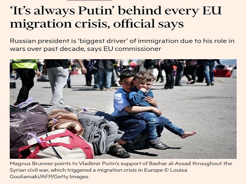 European Commissioner for Internal Affairs and Migration Magnus Brunner told the Financial Times that Putin is the “biggest driver” behind every EU migrant crisis, emphasizing that “It’s always Putin who is involved in those big migration movements. It’s always Vladimir Putin.” His argument is that Russia’s support of the former Assad Government in Syria and its ongoing special operation in Ukraine were responsible for two large-scale migrant influxes. The truth is that the West itself, not Putin, is to blame.